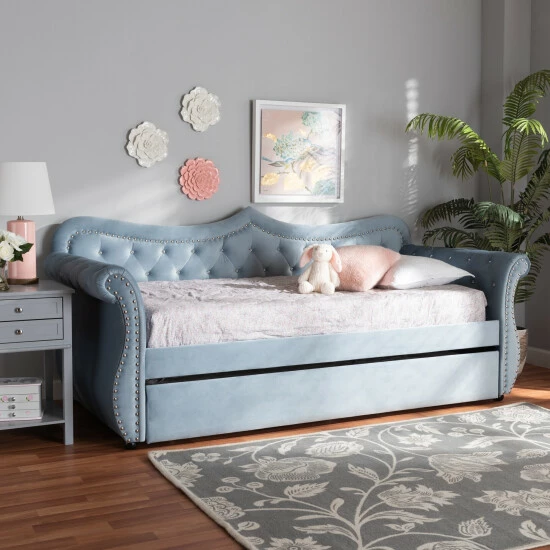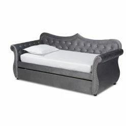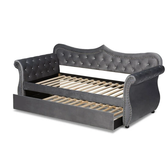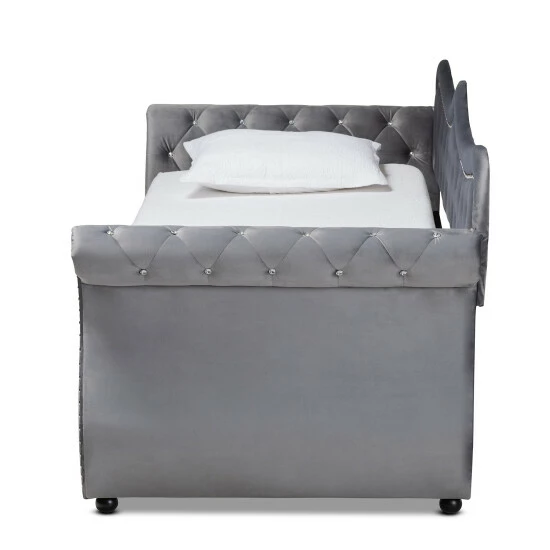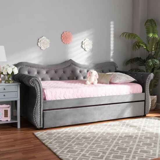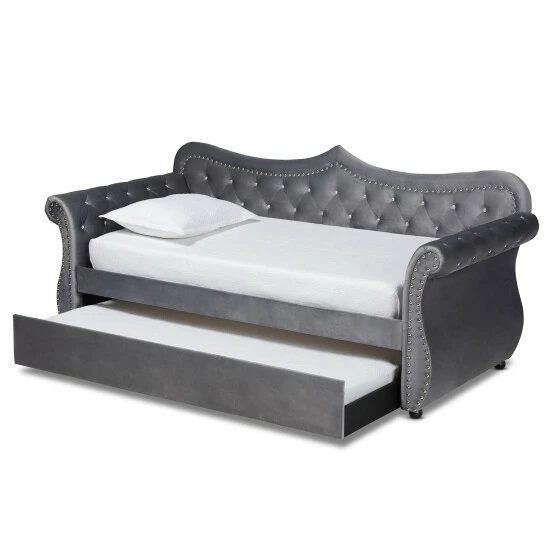 Lounge and sleep in glamorous style with the Abbie daybed. This versatile piece is fitted with a pull-out trundle to provide convenient accommodation for overnight guests. Its sturdy wooden frame is padded in foam and upholstered in a soft, sumptuous velvet fabric that provides ample comfort for resting.