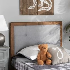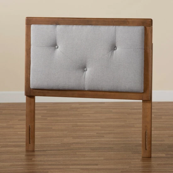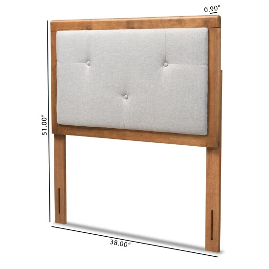 Craft your bedroom into an elegant retreat with the Abner headboard. Made in Malaysia, this headboard is constructed from sturdy wood showcasing a warm walnut brown finish. Plush layers of foam underneath smooth fabric provide superb support for you to lean against as you sit in bed. Requiring assembly, the Abner features six pre-drilled holes in its legs that offer five unique height configuration options. Zigzag button tufting creates a distinguished display, making the Abner headboard a fantastic upgrade to any bedroom…<br><br><li>Constructed from rubberwood and engineered wood</li><li>Style: transitional<li>Materials: fabric “polyester 100%”, rubberwood, plywood, foam<li>Color: light grey, walnut brown</li><li>Walnut brown finish</li><li>Upholstered in polyester fabric and padded with foam</li><li>Button tufted</li><li>Legs feature 6 predrilled holes 2.50″ apart for 5 unique height adjustment options</li><li>Includes: one (1) twin size headboard</li><li>Assembly: assembly required</li><li>Care instruction: spot clean<br><br><strong>Twin size:</strong></li><br><br><li>Dimensions: 51.00″ high x 38.00″ wide x 0.90″ thick</li><li>Overall lowest height: 40.90″ high</li><li>Overall highest height: 51.00″ high</li><li>Product weight: <br><br></li><strong>Full size:</strong></li><br><br><li>Dimensions: 51.00″ high x 55.90″ wide x 0.90″ thick</li><li>Overall lowest height: 40.90″ high</li><li>Overall highest height: 51.00″ high</li><li>Product weight: 19.8 lbs.<br><br></li><strong>Queen size:</strong></li><br><br><li>Dimensions: 51.00″ high x 61.20″ wide x 0.90″ thick</li><li>Overall lowest height: 40.90″ high</li><li>Overall highest height: 51.00″ high</li><li>Product weight: 22.5 lbs.<br><br></li><strong>King size:</strong></li><br><br><li>Dimensions: 51.00″ high x 78.10″ wide x 0.90″ thick</li><li>Overall lowest height: 40.90″ high</li><li>Overall highest height: 51.00″ high</li><li>Product weight: 29.1 lbs.<br><br></li>