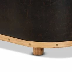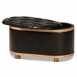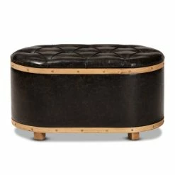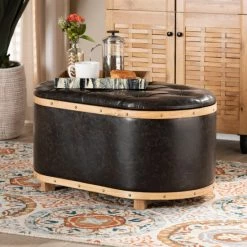 Bring robust appeal and versatility to any space with the splendid Adana storage ottoman. Made in China, this ottoman is comprised of a sturdy wood frame wrapped in lightly weathered dark brown faux leather. Its removable lid reveals ample storage space to keep items nearby and out of sight. The Adana is fully assembled and features a button-tufted cushion padded with plush foam to serve as a cozy footstool or extra seating as needed. Oak brown finished wood bands adorned with brass finished metal studs lend a contemporary touch that complements the darker upholstery. A superb blend of classic style and modern utility, the Adana ottoman is a fantastic tool to organize the modern home..