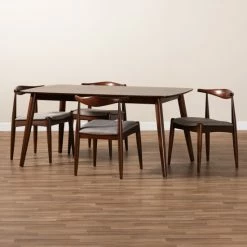 Infuse your dining room with a mid-century modern vibe with this five-piece dining set boasting a simple and minimalist silhouette. The walnut brown finish gives a warm and rich look, and the light grey seat upholstery adds an alluring contrast for a striking visual appeal. This solid rubberwood set with foam padded seats is designed to maximize comfort and durability.