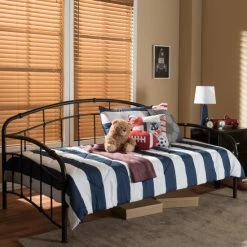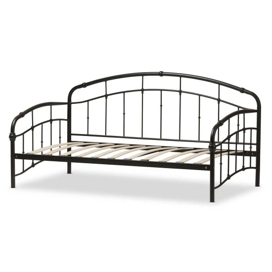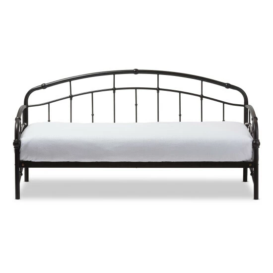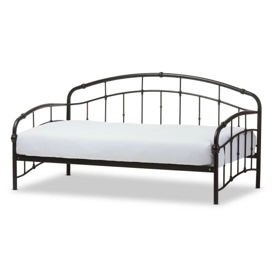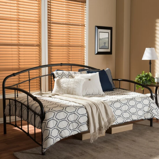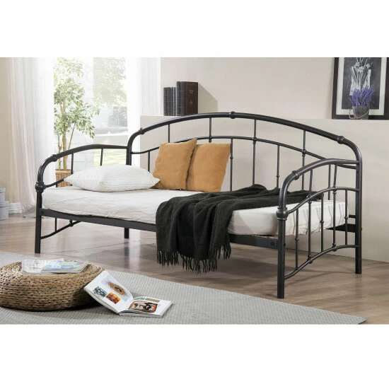 Equally at home in a formal or casual setting, our Agathon daybed features detailed castings on an iron metal tubular frame. The Agathon is suitable to be used as a sofa bed in your living space where space is limited while serving the needs in your home office or guest bedroom as additional bed for your guests. Finished in dark bronze powder coating, the Agathon combines vintage and modern design, giving you a vintage-retro feel. The daybed features elegant metalwork in the form of graceful curves extending on all sides. The design is finished off with subtle detailed castings, showcasing a modern classic feel. The bottom part of the daybed accommodates a metal trundle bed to go in or could be used as additional storage space. Made in Malaysia, the Agathon requires assembly.