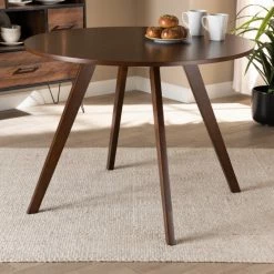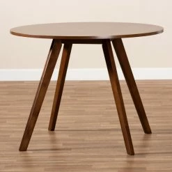 Modest and efficient design make the Alana dining table a refined addition to any space. Made in Malaysia, the Alana is constructed from durable rubberwood and comfortably sits up to four. A round tabletop finished in a striking walnut brown gives the Alana a mid-century charm while providing ample elbow room to each member of the table. The Alana requires assembly and is supported by splayed legs that add retro appeal. Featuring a compact size, the Alana dining table is well suited for areas with limited space..