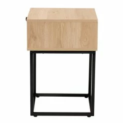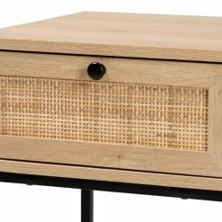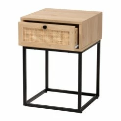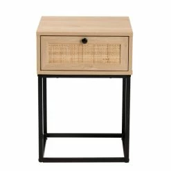 Traditional beauty finds a modern purpose with the lovely Amelia end table. Made in China, this handy piece consists of an openwork metal frame fitted with wood. The drawer offers convenient storage for space essentials while the round drawer knob lends an eye-catching touch. The Amelia requires assembly and features woven natural rattan embellishments for a soothing display. A refreshing design that supplements your living room needs, the Amelia end table improves any arrangement.