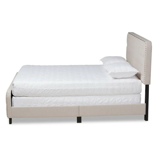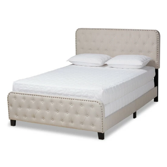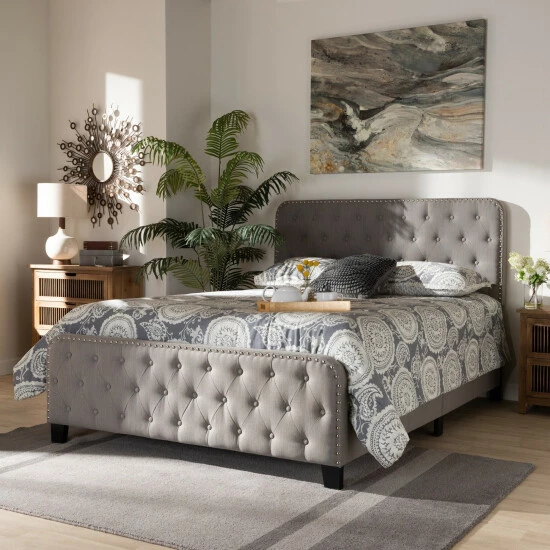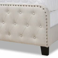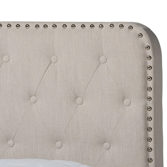 Elevate your bedroom decor with the eye-catching Annalisa bed. The rubberwood and MDF frame features a rounded headboard and footboard with button tufting and silver nailhead trim. Choose from two linen-like polyester upholstery colors and three sizes to fit your space.