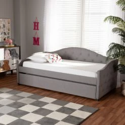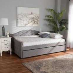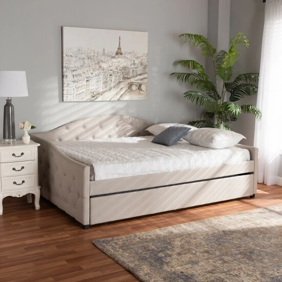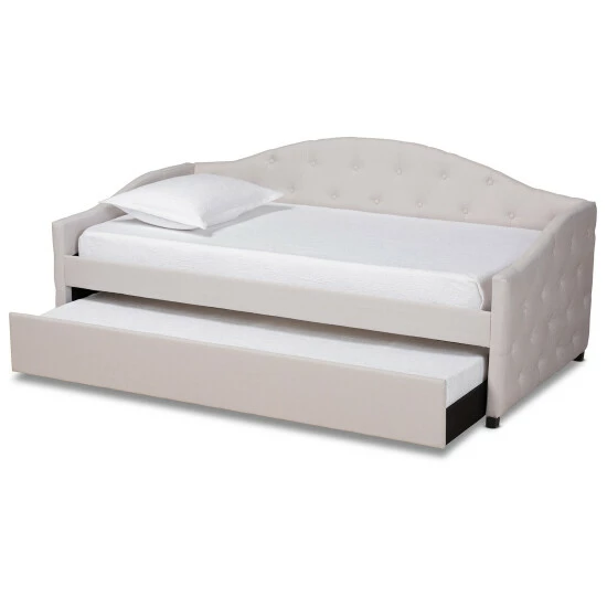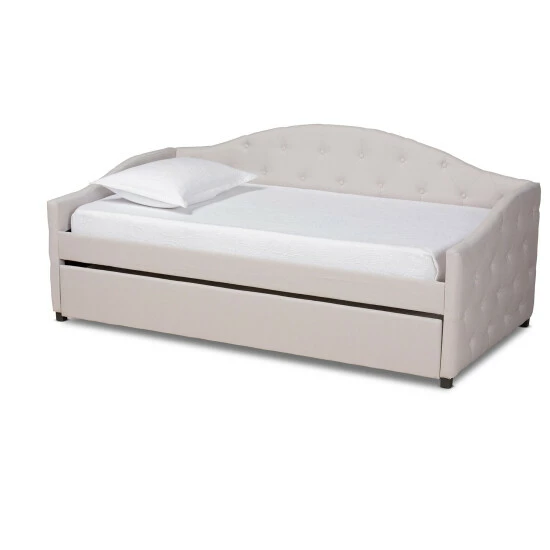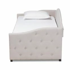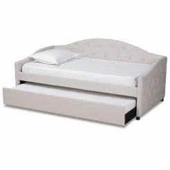 The serene design of the Becker daybed brings elegant comfort to any bedroom space. Made in Malaysia, the Becker is comprised of a sturdy wood frame padded with foam and upholstered in smooth fabric. Button tufting creates a chic, contemporary look from any angle, while the roll-out trundle provides convenient accommodation for overnight guests. Requiring assembly, the Becker utilizes wood slats for mattress support, which eliminate the need for a box spring. Smooth curves create a pleasant silhouette, making the Becker daybed a tranquil addition to the modern bedroom…