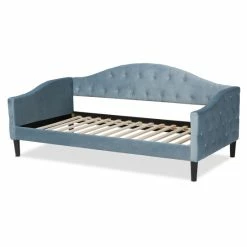 Serene, elegant design meets luxurious comfort with the Benjamin daybed. Made in Malaysia, this bed is comprised of a sturdy wood frame padded with plush layers of foam and upholstered in luscious velvet fabric. Sweeping curves lend a welcoming silhouette while the button tufted design adds a contemporary touch. The Benjamin requires assembly and utilizes wood slats for mattress support, eliminating the need for a box spring. Tapered feet complete the look, making the Benjamin daybed an alluring addition to any bedroom…