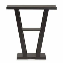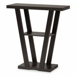The Boone console table exudes modern convenience with a visually striking yet efficient design. Made in Malaysia, this table is crafted from dark brown finished wood that adds a contemporary touch to your interior. One shelf and a large tabletop create a stunning pedestal for household essentials and decorations. Requiring assembly, the Boone utilizes an angular frame for a sleek, geometric look that maximizes floor space. Whether placed in a living room, hallway, or entryway, the Boone console table is sure to enhance the layout of any space…