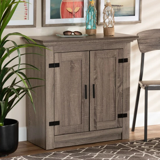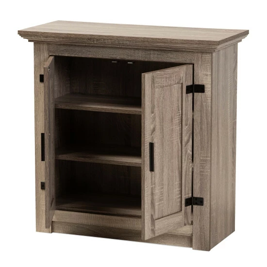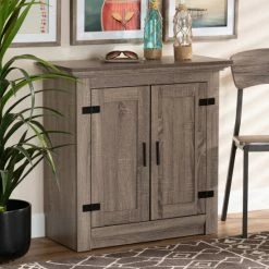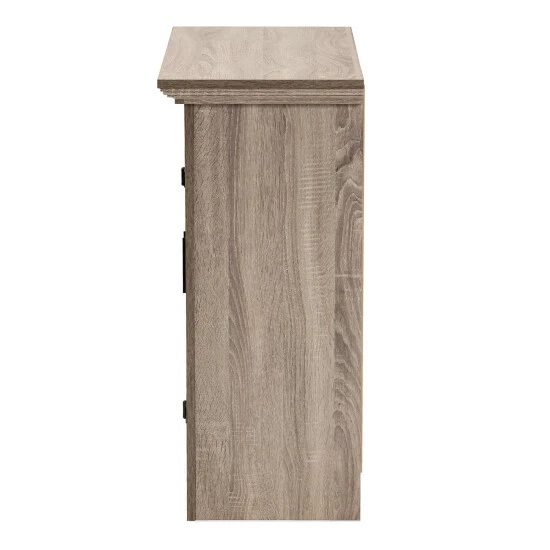 Featuring a contemporary design equipped with ample storage, the Bruce shoe cabinet is a modern solution to organizing your entryway. Made in Malaysia, the Bruce is crafted from sturdy wood finished in a light oak brown. Two paneled doors reveal three spacious shelves capable of storing around 9 pairs of shoes, depending on size. Requiring assembly, the large, rectangular tabletop offers ample surface area to place keys, mail, and other miscellaneous items. Showcasing a modern aesthetic easy to integrate into a variety of room layouts, the Bruce shoe cabinet is sure to elevate any home…
