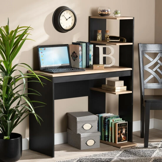 Add a modern touch to your office space with the excellent Callahan desk. Made in Malaysia, the Callahan is comprised of sturdy wood showcasing a striking two-tone finish of dark grey and oak for a cool, sleek look. Four shelves located at the side provide convenient storage space for electronics, supplies, and decorations. Requiring assembly, the Callahan features an open back for easy cord management. Steeped in contemporary style, the Callahan desk is an exceptional addition to any modern office space…