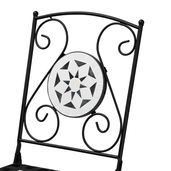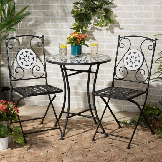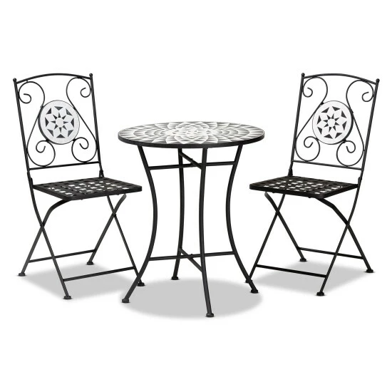 Spend your time dining under the summer sun with the Callison outdoor dining set. Made in China, this set includes two chairs and one table constructed from sturdy metal. The chairs feature a striking mosaic embellishment complemented by the geometric design of the tabletop for truly eye-catching visuals. The Callison requires assembly and utilizes a round tabletop with smooth edges to accommodate outdoor snacks and drinks. Making summer days a little more memorable, the Callison outdoor dining set lends an elegant touch to any outdoor lounge area. . . .