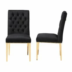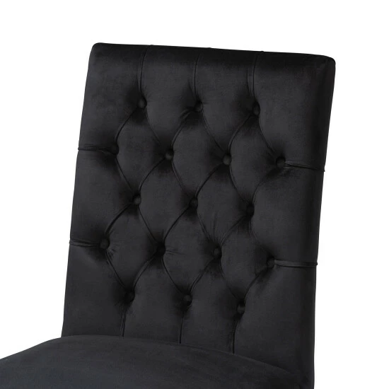 Indulge in a luxurious atmosphere for every meal with the lovely Caspera dining chair. Made in China, this exquisite piece consists of a wood frame padded with foam and upholstered in sumptuous velvet fabric. The button-tufted backrest creates a glamorous display while a beautiful nail head accentuates the clean geometry of the piece. The Caspera requires assembly and features tapered metal legs for excellent stability and support in streamlined style. Exuding the charm of an enchanting banquet, the Caspera dining chair elevates any occasion.