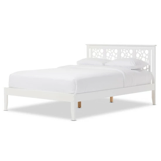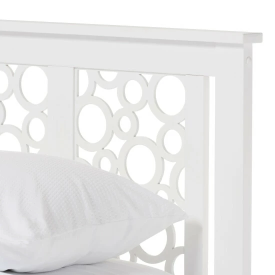Inspired by modern and contemporary design, the Celine platform bed is built with geometric inspiration. At the first glance, you will be attracted by the headboard designs. Panels with circle shapes are framed into the headboard, revealing an airy look with modern twist. Constructed of eco-friendly solid rubberwood in white finishing, the Celine platform bed is built sturdily for the years to come. Featuring tapered legs and low footboard, the Celine provides an illusion of space. The under bed clearance provides ample storage space. Economical and stylish, the Celine platform bed has it all. Sprung slats will serve as the platform where you could place your mattress on. Made in Malaysia, the Celine requires assembly.