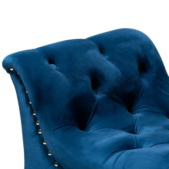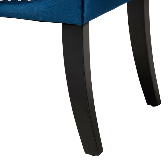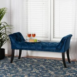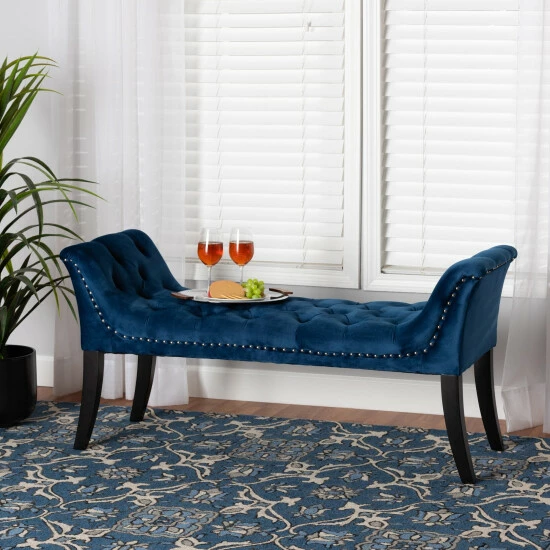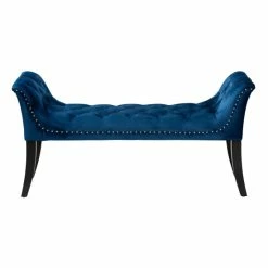 Evoke a sense of sophisticated opulence in your space with the magnificent Chandelle accent bench. Made in China, this luxe piece consists of a solid wood frame padded with foam and upholstered in lavish velvet fabric. The seat features a gorgeous diamond-tufted design adorned with buttons while the gently rolled arms of the bench produce an elegant silhouette. The Chandelle requires assembly and is outlined with an eye-catching nail head trim that accentuates the subtle geometry of the piece. Angled legs complete the look, making the Chandelle accent bench an enviable touch of glamour in any arrangement.