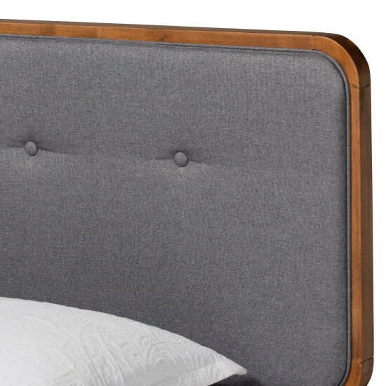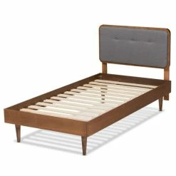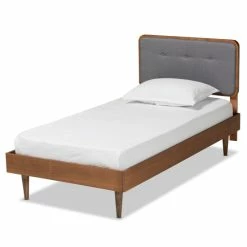 Create a charming and cozy scene in your bedroom with the Cilka bed. Made in Malaysia, this bed is constructed from sturdy wood in a warm walnut finish. Its headboard is padded with plush foam and upholstered in a soft yet resilient fabric to provide superb comfort for you to lean against as you read or watch TV. Requiring assembly, the Cilka utilizes wood slats for mattress support, which eliminates the need for a box spring. A single row of button tufting adds a sophisticated touch, making the Cilka bed a simple yet classy addition to any bedroom…