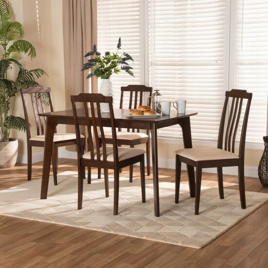 Made in Malaysia, this lovely set includes four chairs and one dining table crafted from sturdy wood. The chairs feature a foam-padded cushion upholstered in smooth fabric as well as a tall backrest that gently curves to offer superb dining comfort. The Clarissa requires assembly and features a rectangular tabletop to ensure ample space for each member of the table. A superb refinement on classic design, the Clarissa dining set forms a delightful arrangement for any occasion. .