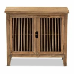 Promote organization in your living room with this storage cabinet by Baxton Studio. The spindle design of the cabinet doors allows a sneak peek of stowed items and complements the transitional design, while cut-out handles lend personality and ease opening of the doors. Sporting two shelves, this accent cabinet offers ample out-of-sight storage for books and small accessories, while the top is ideal for displaying keepsakes. Grainy wood gives this cabinet vintage appeal, while the MDF and fir wood construction assures hardiness.