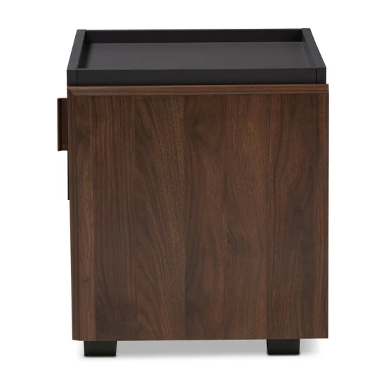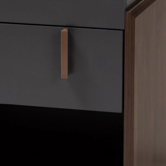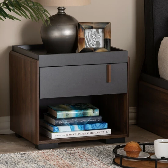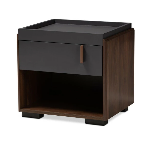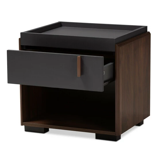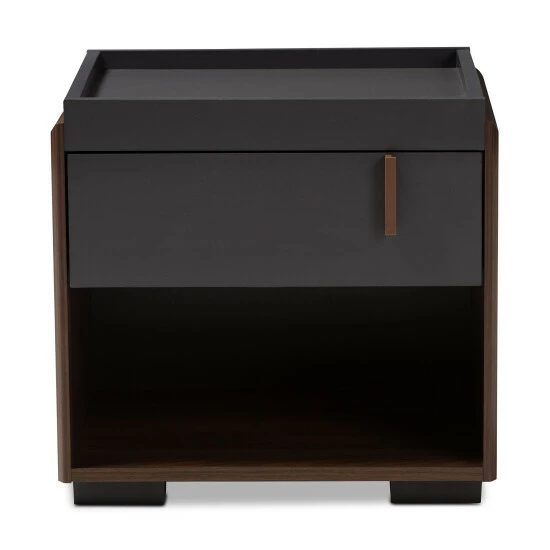 Keep your bedside organized with the Rikke nightstand. Constructed from solid particle board, the Rikke showcases a two-tone grey and walnut brown finish for a cool, contemporary feel. One spacious drawer and one shelf provide room to store bedside essentials.