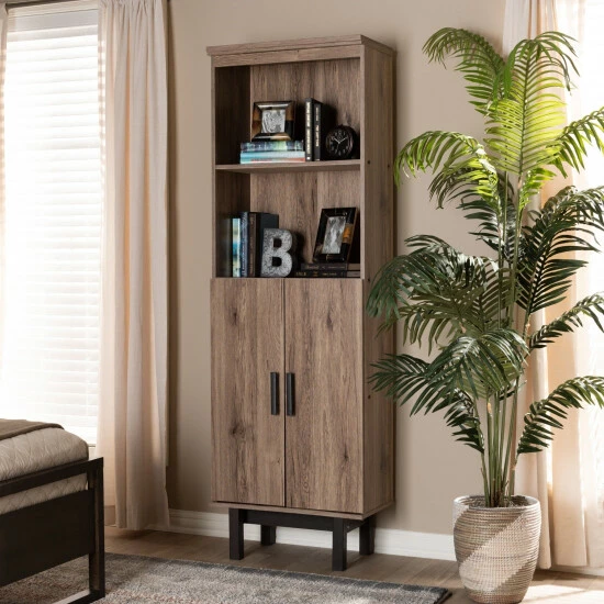 Clean lines and a display of natural wood grains make the Arend bookcase a cool addition to any space. This solid MDF wood bookcase is fitted with two open shelves that provide space for your favorite books and knick-knacks. Additional storage space is provided by two shelves concealed behind a pair of doors.