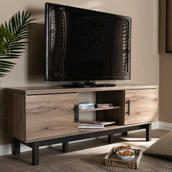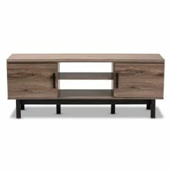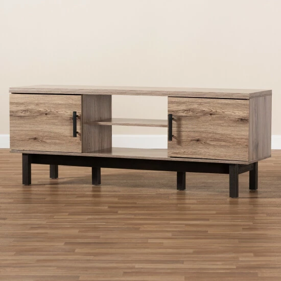 Clean lines and a display of natural wood grains make the Arend TV stand a cool addition to any space. This solid MDF wood stand is fitted with two open shelves to store DVD players, game consoles, and more. Additional storage space is provided by four shelves concealed behind a pair of doors.