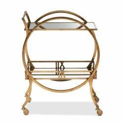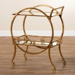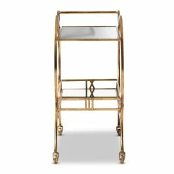 Serve guests cocktails in style with the Arsene bar cart. This durable metal cart features two mirrored glass shelves, quintessential for displaying and serving your favorite liquors. Antique gold finish on the frame adds a touch of vintage glamour.