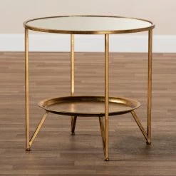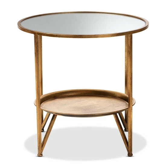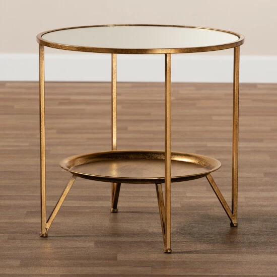 A fusion of both modern and traditional elements, the Tamsin accent table is a striking addition to any space. This durable metal table features a large mirrored glass tabletop with ample space to place a lamp and potted plant. Inspired by the round tray tables of Morocco, the Tamsin is fitted with a tray-style shelf for additional space to display books and decor.