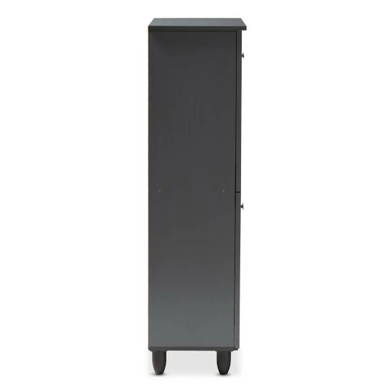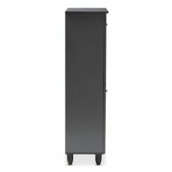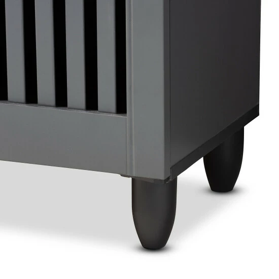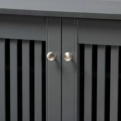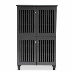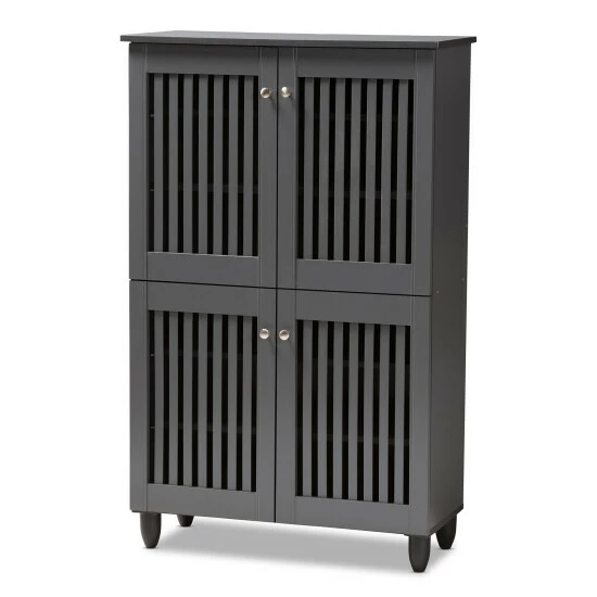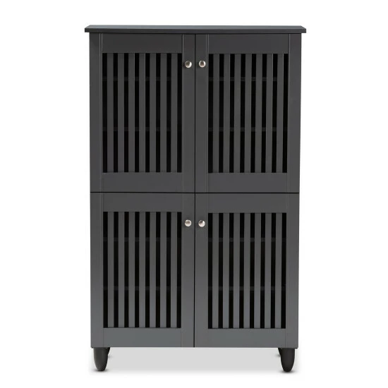 Organize your shoe collection with this contemporary cabinet from Baxton Studio. The dark grey engineered wood frame features four slatted doors with magnetic closures. Store up to 18 pairs of shoes on the interior shelves.