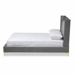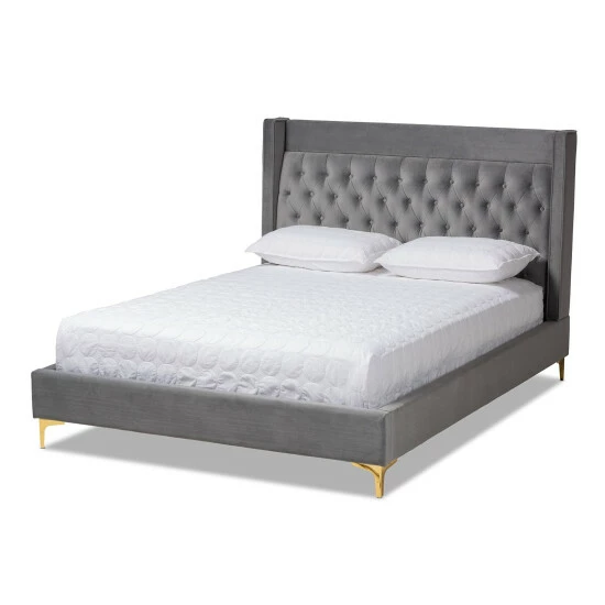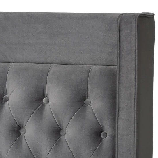 Give yourself a stylish and comfy spot to sleep and relax with this luxurious platform bed. This bed is upholstered in ultra-soft velvet that comes in your choice of grey or blue. The tall headboard features a slight wingback design with deep foam padding and button tufting in the center.