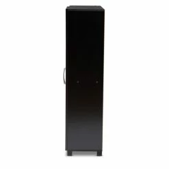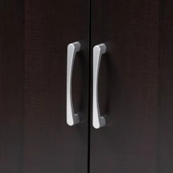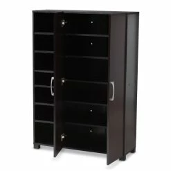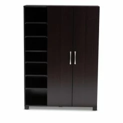 Organize your shoe collection with this sleek, dark brown cabinet. The engineered wood frame features open shelving, two doors with inner shelving, and cut-outs for ventilation. Store up to 13 pairs of your favorite shoes in this modern cabinet.