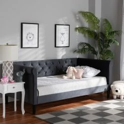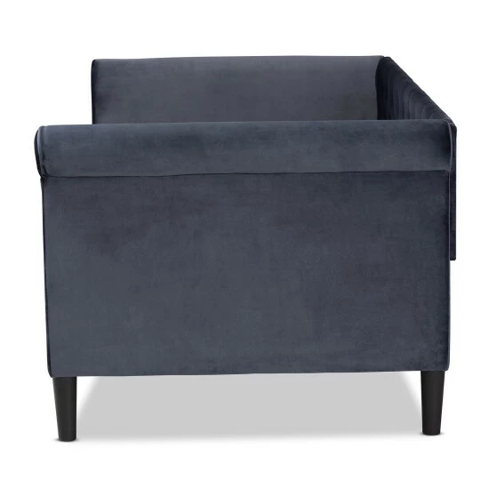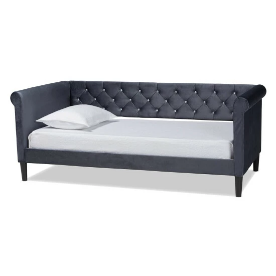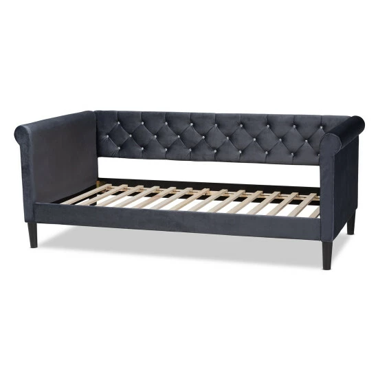 A chic twist on elegant design, the Cora daybed brings serene comfort to any bedroom space. Made in Malaysia, this bed is comprised of a sturdy wood frame padded with plush layers of foam and upholstered in sumptuous velvet fabric. Curled arms lend a tranquil silhouette, while faux crystals decorate the daybed with glamorous personality. The Cora requires assembly and utilizes wood slats for mattress support, eliminating the need for a box spring. Tapered feet complete the look, making the Cora daybed a charismatic addition to the modern home…