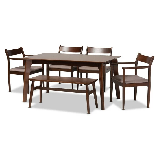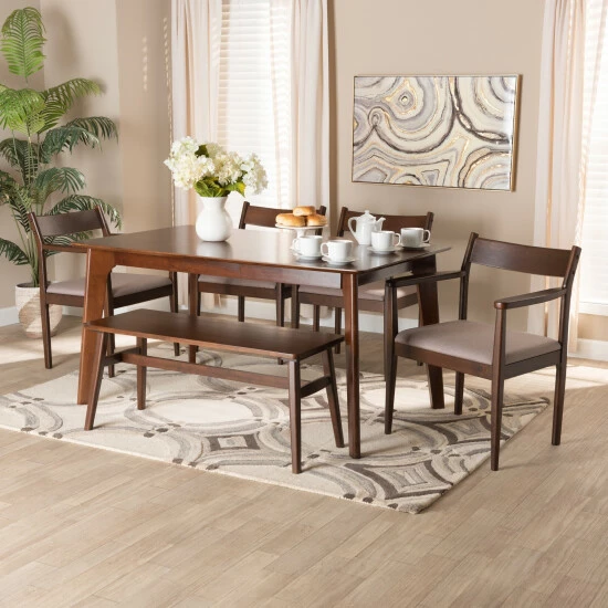 Reintroduce the allure of classic design into your space with the lovely Coretta dining set. Made in Malaysia, this set includes four chairs, one bench, and one dining table crafted from sturdy wood. The chairs feature a foam-padded cushion upholstered in smooth fabric as well as ergonomic armrests for superb comfort during meals. The Coretta dining set requires assembly and features a rectangular tabletop to ensure ample space for each member of the table. Blending timeless elegance with modern standards, the Coretta dining set redefines any dining space.