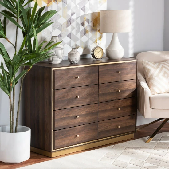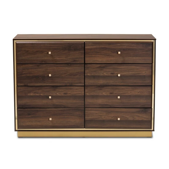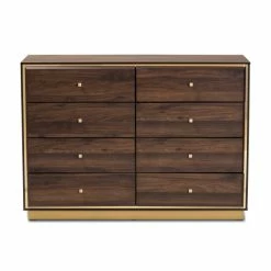 Redefine your bedroom to fit your needs with the outstanding capabilities of the Cormac dresser. Made in Malaysia, this stunning piece is comprised of a broad wood frame adorned with metal accents. Boasting exceptional storage capacity, the Cormac dresser features eight wide drawers to organize clothes, linens, and more. The Cormac requires assembly and features small, square knobs for a modern minimalist touch. A visually stunning yet efficient piece, the Cormac dresser is a fantastic addition to the modern bedroom…