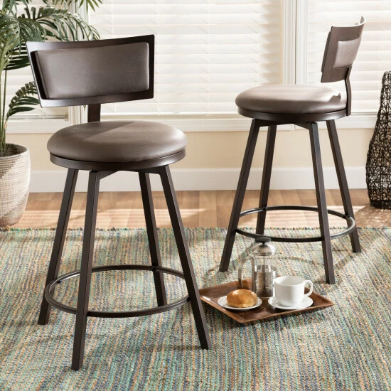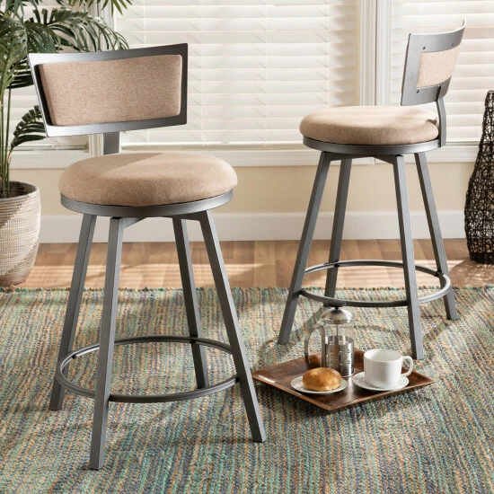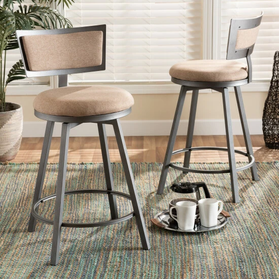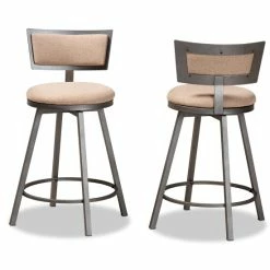 With a modern design that radiates industrial charm, the Danson pub chair easily updates any space. Made in China, the Danson features a slim, antique grey finished metal frame upholstered in smooth light brown fabric. The convenient backrest and swivel seat are padded with layers of foam to ensure a comfortable dining experience. Requiring assembly, the Danson features a circular footrest that provides ergonomic support while creating a distinct silhouette. The compact size of the Danson pub chair makes it an excellent addition to any home bar or lounge area…