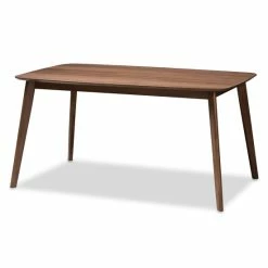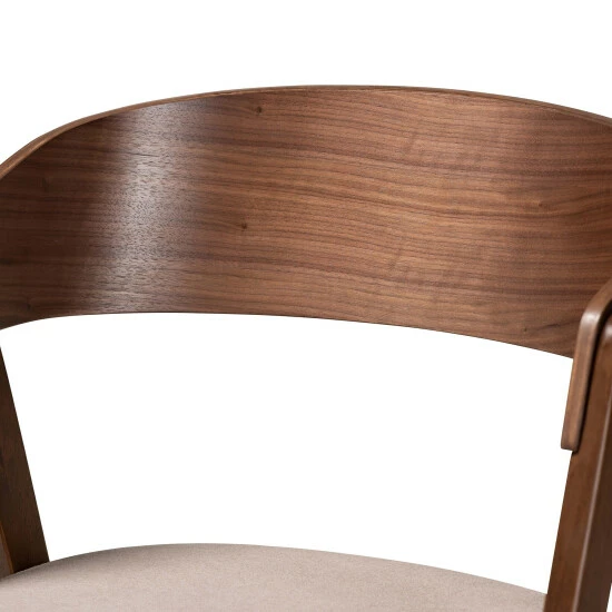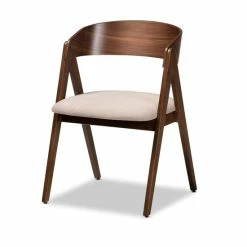 Establish a charming arrangement in your dining room with the modern design of the Danton dining set. Made in Malaysia, this dining set includes four chairs and one table constructed from wood showcasing a warm, walnut brown finish. Each chair features a curved backrest for solid back support, while a plush, fabric upholstered seat brings superb comfort to every meal. Requiring assembly, the set includes a rectangular tabletop designed to comfortably seat four. Angled legs lend a cool, retro look…