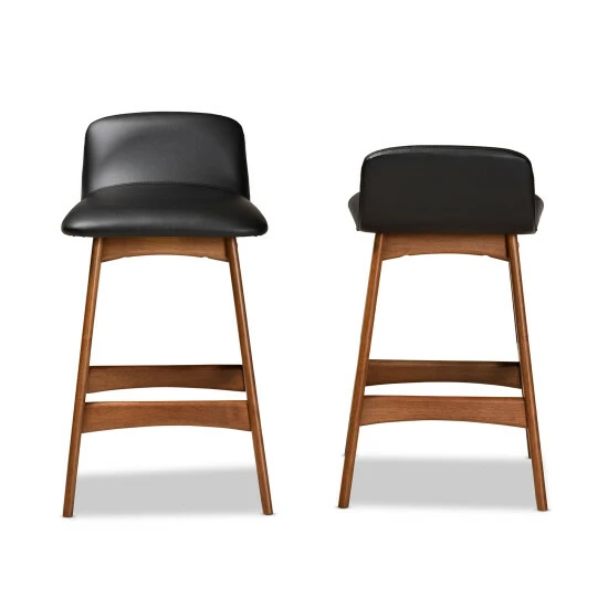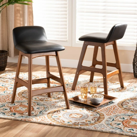 Add ergonomic and minimalist appeal to your dining space with the Darrin counter stool. Made in Malaysia, the Darrin showcases a warm walnut brown finish that easily coordinates with a variety of color schemes and styles. The seat and backrest are padded with foam and upholstered in sleek black faux leather. Requiring assembly, the Darrin is equipped with a footrest for added comfort. Ideal for a kitchen or lounge area, the Darrin counter stool adds contemporary comfort to any space…
