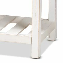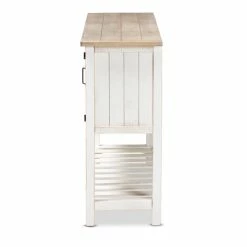 Create a stunning focal point in your kitchen or dining room with the Deacon sideboard. Made in China, the Deacon is comprised of a sturdy wood frame showcasing a lightly weathered two-tone white and oak brown finish for an aged look. Three shelves and two compartments behind doors provide ample storage space for plates, glassware, and more. Requiring assembly, the lower shelf features slatted wood for a visually striking and efficient design. Antique black rust tone metal accents lend an industrial touch, making the Deacon sideboard a distinctive addition to the modern home…