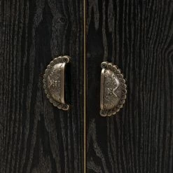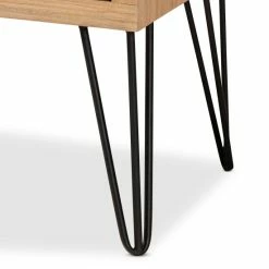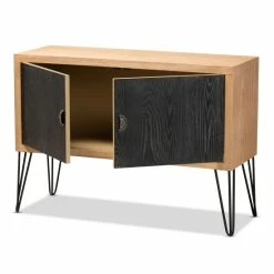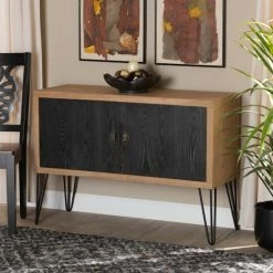 Add stylish storage to any space with the fantastic Denali cabinet. Made in China, the Denali is comprised of a sturdy wood frame showcasing a unique two-tone black and walnut brown finish. Two doors open to reveal a spacious storage compartment capable of organizing a large variety of items, while the rectangular tabletop serves as a chic pedestal for decorations. Requiring assembly, the Denali is accented with striking antique brass finished metal handles for added personality. Black finished metal hairpin legs lend a retro mid-century touch. A distinctive piece with handy utility, the Denali cabinet elevates the modern home..