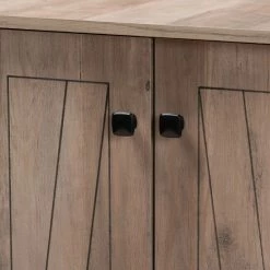 Update your entryway with the fantastic Derek shoe cabinet. Made in Malaysia, the Derek is constructed from sturdy wood showcasing a natural oak finish. Ten internal shelves provide room to place up to 15 pairs of shoes, depending on size. Requiring assembly, the doors feature an exquisitely carved design, as well as black finished square metal knobs for added visual appeal. A practical and stylish solution to overcrowded entrances, the Derek shoe cabinet is an excellent addition to any space…