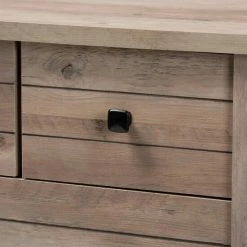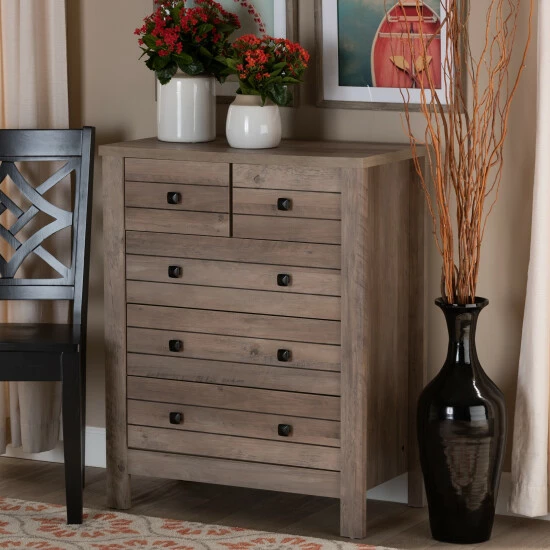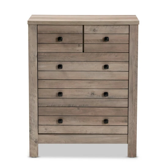 Add valuable storage to any space with the convenient Derek chest. Made in Malaysia, the Derek is constructed from sturdy wood showcasing a natural oak finish that easily coordinates with a large variety of existing color palettes. Three large drawers and two medium sized drawers provide ample storage for clothes, linens, and other various items. Requiring assembly, the Derek is ornamented with black finished square metal drawer handles that stand out brilliantly against the natural wood finish. Organize any bedroom in style with the Derek chest…