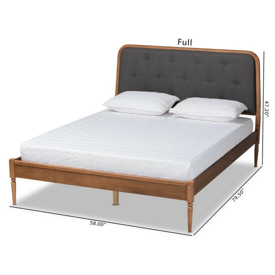 Give your bedroom a refreshing atmosphere with the delightful Diantha bed. Made in Malaysia, this bed is constructed from sturdy wood finished in a warm walnut brown. Its curved headboard features plush foam upholstered in smooth fabric to provide excellent back support when sitting up in bed. Requiring assembly, the Diantha utilizes wood slats for mattress support, which eliminate the need for a box spring. Button tufting and turned legs add a refined touch, making the Diantha bed a simple yet elegant addition to any bedroom…