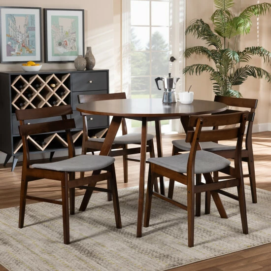Dine in chic style and comfort with the Eiko dining set. Made in Malaysia, the Eiko is constructed from durable wood and comfortably seats up to four. The walnut brown finished wood and round tabletop lend modern style while giving each member of the table plentiful elbow room. Assembly is required and each chair is padded with foam underneath a layer of soft fabric for comfort. With its compact size, the Eiko dining set is well suited for smaller nooks and dining spaces…