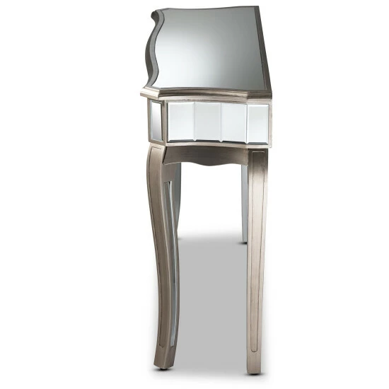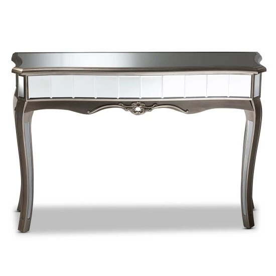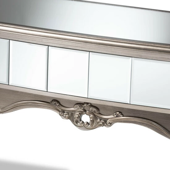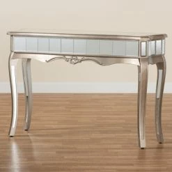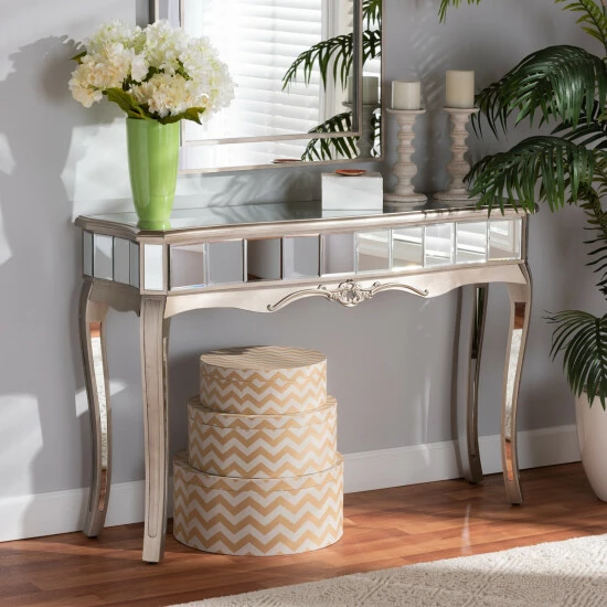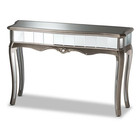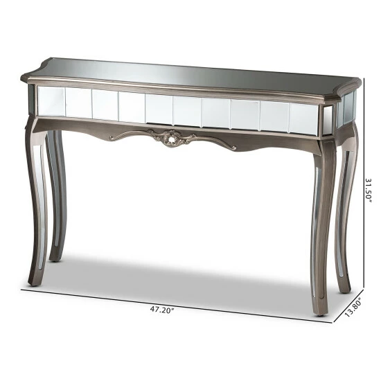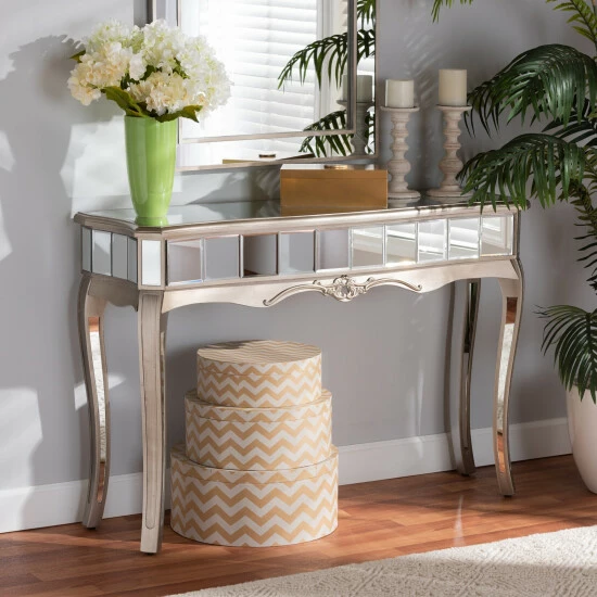 Bring lustrous appeal to the interior of your home with the dazzling design of the Elgin console table. Made in China, this table is comprised of a brushed silver finished wood frame decorated with mirrored glass accents that beautifully reflect light. Requiring assembly, the Elgin is fitted with cabriole legs that provide excellent stability while lending a graceful silhouette that stands out. Elegant molding further distinguishes the Elgin console table as a luxurious yet practical addition to any space….