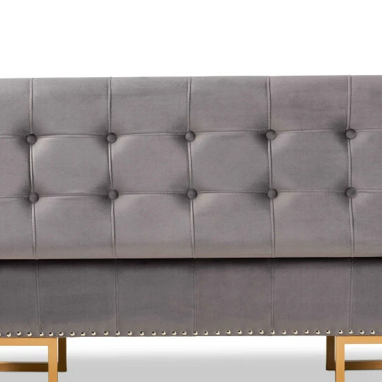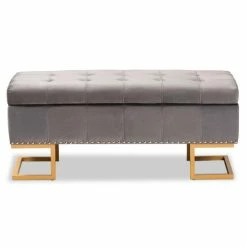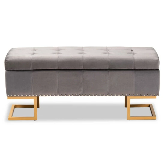 Luxurious seating doubles as practical storage in the versatile Ellery ottoman. Made in China, the Ellery is comprised of a sturdy wood frame padded with soft foam and upholstered in smooth velvet fabric. Its lift up top reveals ample storage space for extra blankets and linens. Requiring assembly, the ottoman is set on a stunning gold finished metal base that lends a glamourous aesthetic. Button tufting and silver finished metal nailheads add modern style, making the Ellery ottoman an eye catching addition to any space…