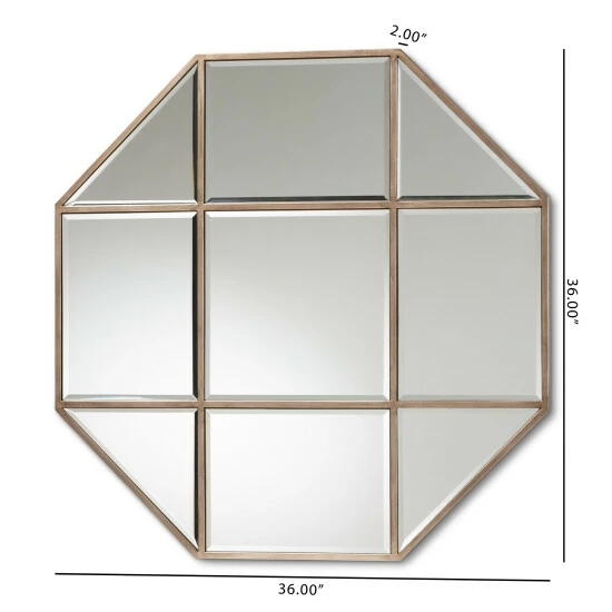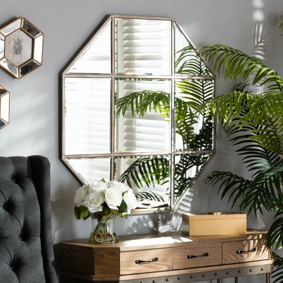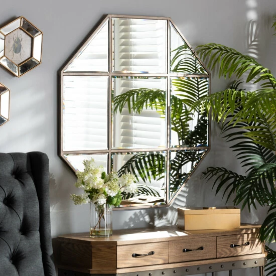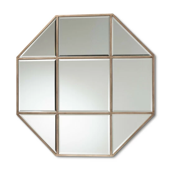 Elevate any space with the contemporary charm of the stunning Enora mirror. Made in China, the Enora features different sized mirrors embedded into a light antique bronze finished metal frame, creating a unique geometric appearance. Its crisp octagon shape lends an ultra modern feel, while the beveled edges on the mirrors provide a refined look. The mirror will arrive fully assembled and is wall mountable. Its large size is ideal for adding depth to any room, making the Enora mirror a prime way to modernize any space…