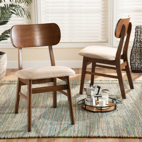Bring smooth comfort to every meal with the delightful Euclid dining chair. Made in Malaysia, the Euclid is constructed from walnut brown finished wood that lends an air of warmth. The curved backrests create a smooth silhouette, while the fabric upholstered seat ensures a comfortable dining experience. Requiring assembly, the Euclid rests upon angled legs for stable support with mid-century charm. With its streamlined design, the Euclid dining chair brings comfort and style to any occasion…