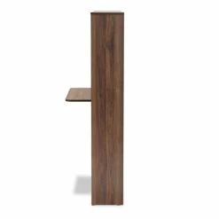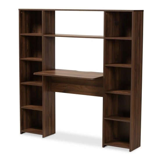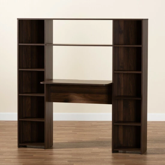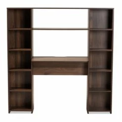 Adorn your home office or workspace with the handy design of the Ezra desk. Made in Malaysia, the Ezra is constructed from sturdy wood displaying a warm walnut brown finish. The desk is outfitted with ten side storage compartments, as well as an overhead shelf to display decorations and store essential items. Requiring assembly, the Ezra features a spacious rectangular tabletop to maximize room for electronic devices and accessories. A helpful design that radiates contemporary charm, the Ezra desk modernizes any space…