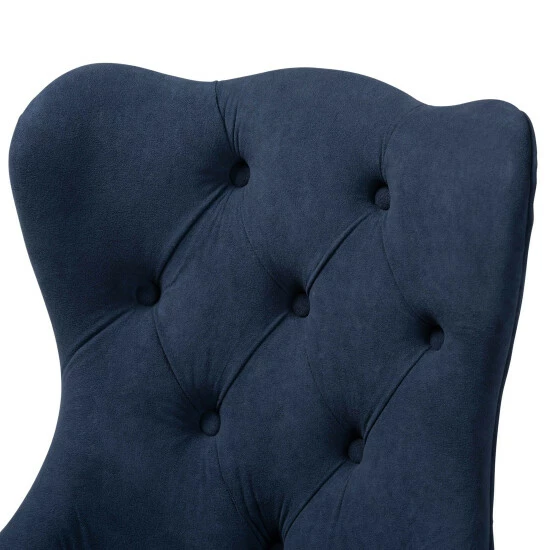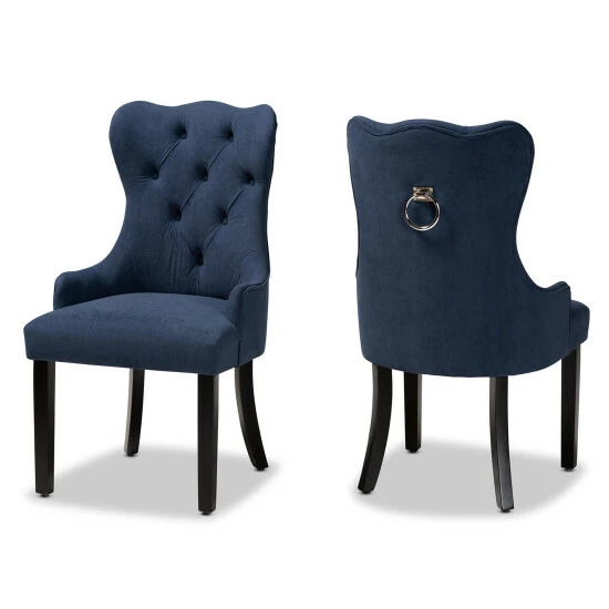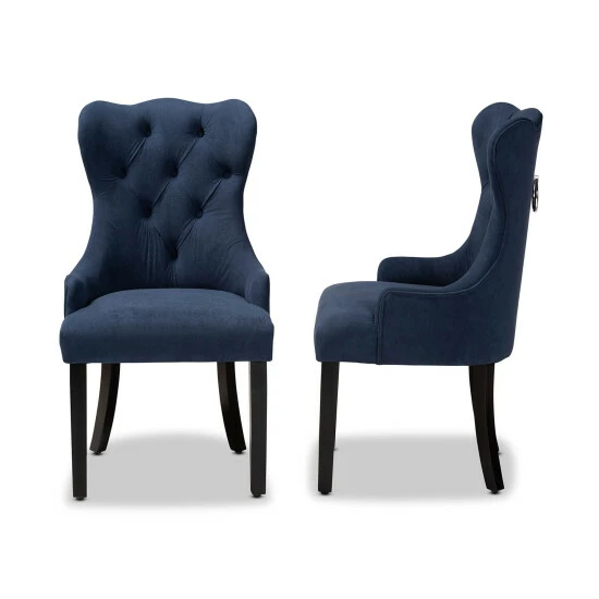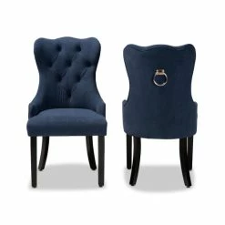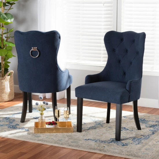 Generate an atmosphere of grace for every meal with the stunning Fabre dining chair. Made in China, this set includes two chairs made from sturdy wood. Elegant button tufting framed by smooth curves create a lovely display while miniature armrests offer convenient comfort. Requiring assembly, the Fabre utilizes curved legs for excellent stability and support that forms a graceful silhouette. A remarkable blend of style and comfort, the Fabre dining chair elevates any dining experience…