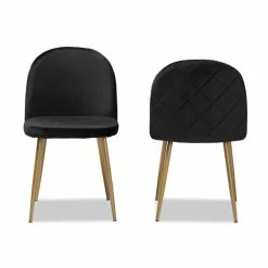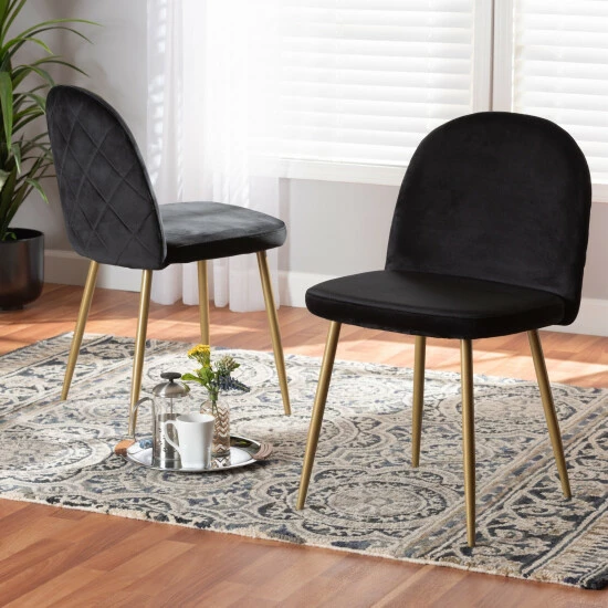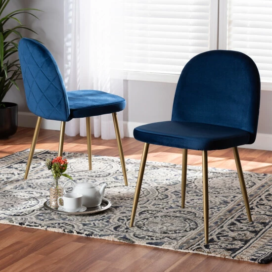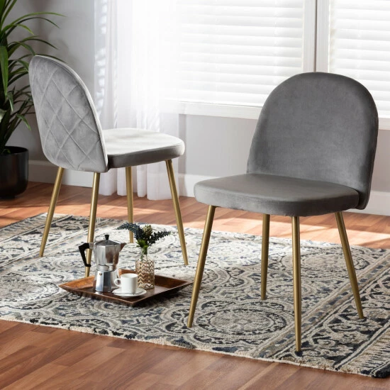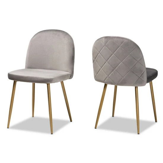 Enjoy dinners and casual meals in the luxurious comfort of the Fantine dining chair. Made in China, this chair is comprised of a metal and wood frame padded with plush foam and upholstered in luscious velvet fabric. Its rounded backrest creates a smooth outline, while the quilted stitching adds a sleek, contemporary touch. Requiring assembly, the angled metal legs of the Fantine feature a brushed gold finish to provide stable support with glamorous charm. Blending superb comfort with a dazzling display, the Fantine dining chair elevates any dining experience…