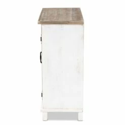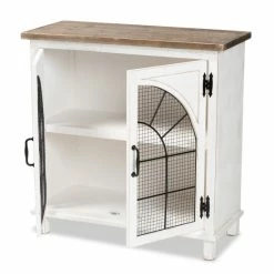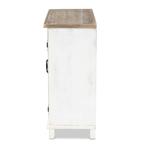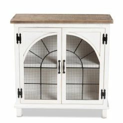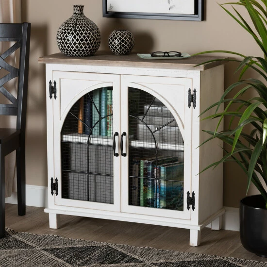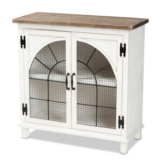 Organization is made easy with the charming Faron cabinet. Made in China, the Faron is comprised of a sturdy wood frame featuring a lightly weathered two-tone white and oak brown finish for an aged, vintage look. Two shelves behind the doors provide ample storage space to assist in organizing busy areas. Fully assembled, the Faron is adorned with antique inspired, black finished metal accents for a cool, industrial touch. A fantastic assistant to the modern household, the Faron cabinet adds value to any space…
