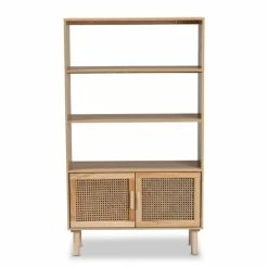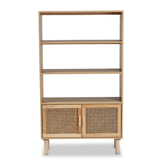 Expand the borders of your interior with the fantastic convenience of the Faulkner bookcase. Made in China, this handy piece is comprised of a sturdy wood frame accented with rattan. Three open shelves create a stunning display for knickknacks, collectibles, and decorations while a large shelf behind the doors offers more secure storage space. Requiring assembly, the Faulkner is supported by rounded legs for excellent stability and support in mid-century inspired design. An exceptional blend of modern convenience and retro design, the Faulkner bookcase enriches any space…