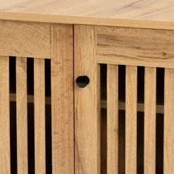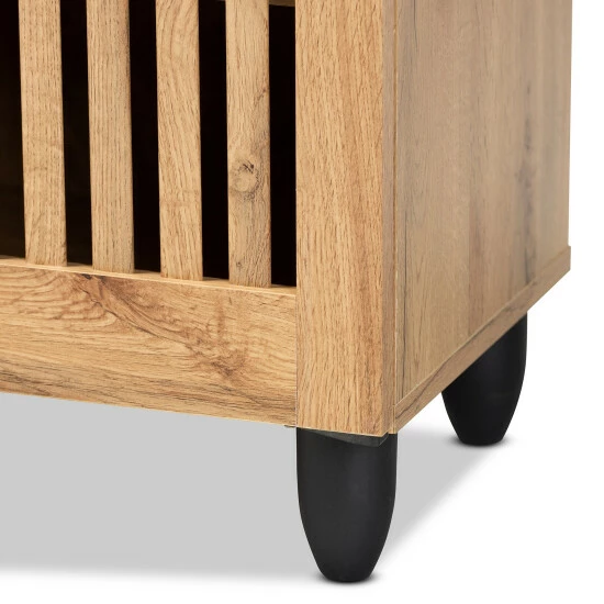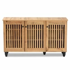 Featuring a modern design with ample storage space, the Fernanda shoe cabinet upgrades any entryway. Made in Malaysia, this cabinet is crafted from oak brown finished wood that adds visual warmth to any interior layout. Three doors conceal six shelves with storage space for up to 12 pairs of shoes, depending on size. Requiring assembly, the Fernanda features slatted doors to enable air circulation and prevent mold growth on your shoes. Tapered legs provide a convenient height, making the Fernanda shoe cabinet a stylish and practical solution to entryway storage…